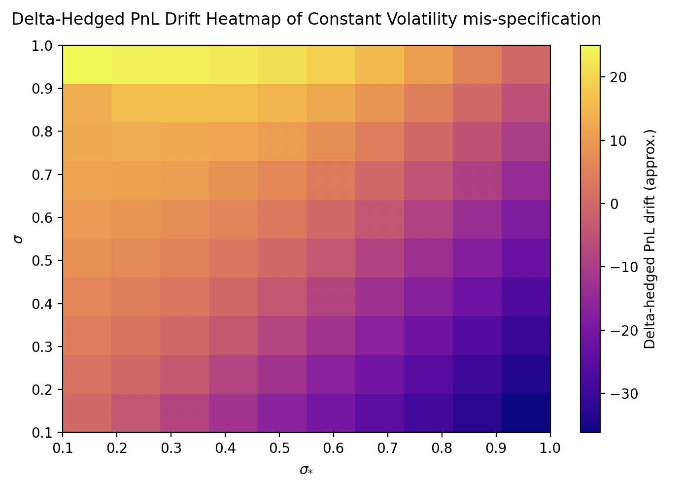 \[\text{PnL}(t) = \int_{0}^{t} \frac{1}{2}[\sigma^2 - \sigma_*^2] S_t^2 \frac{\partial^2 V}{\partial S^2} dt\]Heatmap shown below: